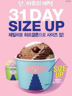 31DAY는 5가지 맛의 아이스크림을 골라 담을 수 있는 패밀리 사이즈 구입 시 6가지 맛을 제공하는 하프갤론으로 사이즈 업그레이드를 제공하는 행사다.