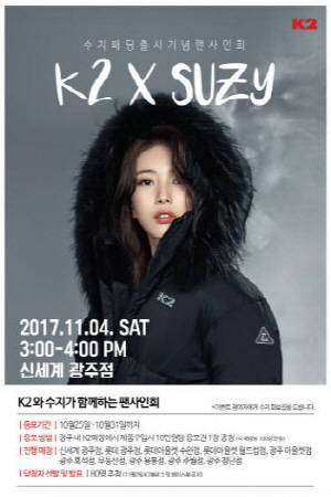 이번 팬사인회는 지난 10월26일부터 31일까지 광주 지역내 K2 매장에서 10만원 이상 구매한 고객에 한해 응모를 통해 당첨된 80명을 대상으로 진행된다. 당첨자 추첨은 당일 팬사인회에 앞서 오후 1시부터 이뤄진다.