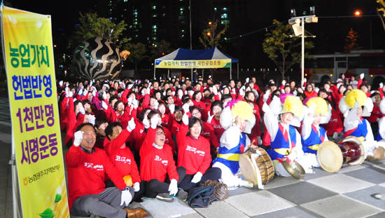 농협중앙회(회장 김병원)는 내년에 예정된 헌법 개정에 농업의 공익적 가치를 반영해야 한다는 국민적 공감대를 확산하기 위해 지난 1일 중앙본부 대강당에서 추진결의대회를 개최하고 현재 전국적으로 1000만명 서명운동을 실시하고 있다.