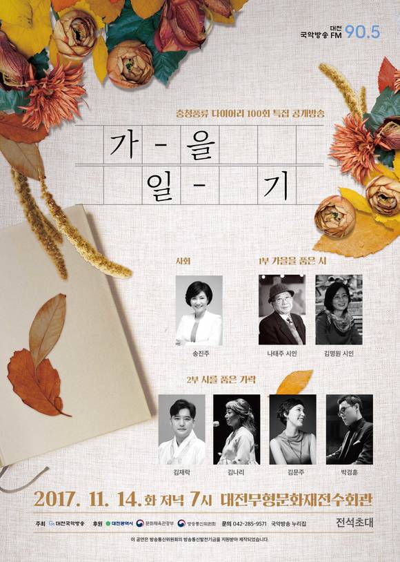 공개방송 가을 일기는 오는 14일 화요일 저녁 7시부터 국악방송 웹 TV, 페이스북 LIVE를 통해 전국 어디서나 생방송으로 시청할 수 있다.