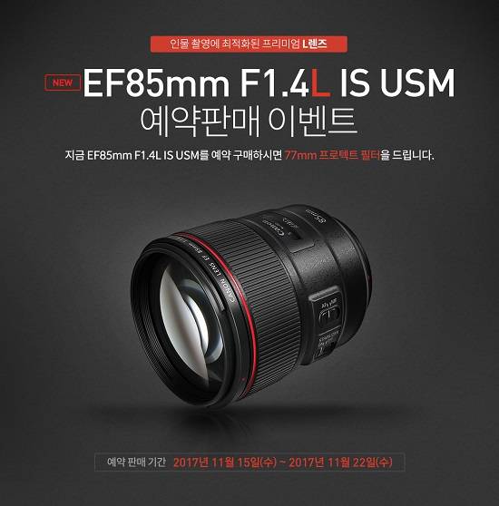 [프라임경제] 캐논코리아컨슈머이미징(대표 강동환)은 오는 15일부터 22일까지 총 8일간 프리미엄 L렌즈 'EF 85㎜ f/1.4L IS USM' 예약 판매를 진행한다고 밝혔다. 이 제품은 오는 12월 중순 정식 발매 예정으로, 가격은 180만원이다.
