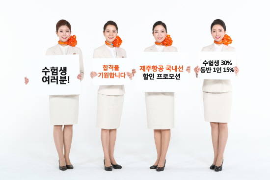 제주항공은 대학수학능력시험 이후 수험생과 가족의 대학별 면접 등을 위한 국내선 이동편의를 돕기 위해 수능 수험생 할인을 해준다. 수능 수험생 할인은 탑승일을 기준으로 오는 11월17일부터 2018년 1월31일까지 △김포~제주 △부산~제주 △청주~제주 △대구~제주 △광주~제주 △김포~부산 등 6개 전 노선이 대상이다.