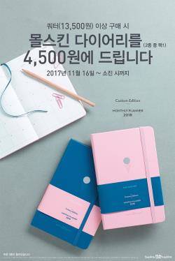 몰스킨 다이어리는 한정수량 제작돼 조기 소진될 수 있으며 프로모션 참여 시 다이어리를 제외한 구매금액의 0.5%에 해당하는 해피포인트 적립혜택을 제공한다. 타 쿠폰, 타 행사, 제휴할인 등 중복적용은 되지 않는다.
