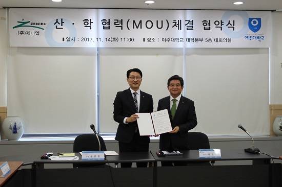 여주대학교 본관 5층 대회의실에서 진행된 협약식에는 윤준호 총장, 류기원 산학협력단장, 김형천 학생지원처장, 유유순 입학지원처장 등 교수진과 박인주 제니엘 회장과 원용수 상무를 비롯한 임직원 등이 참석했다.