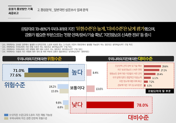 전국적으로 '우리나라 지진에 대한 전반적 위험수준'을 묻는 질문에 응답자 10명 중 7명(77.6%)이 우려된다고 답한 것에 비해 대비수준은 낮다(78.%)고 봤다. 국민 대다수가 국가의 지진대비의 소홀함을 우려하고 있다는 뜻이다.