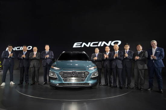 현대차가 이번 모터쇼에서 최초 선보인 중국형 소형 SUV '엔시노'는 지난 6월 글로벌 론칭한 현대차 첫 소형 SUV 코나를 바탕 삼아 중국 소비자 운전 습관과 기호 등을 반영해 중국형으로 출시한 차량이다.