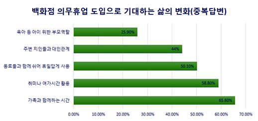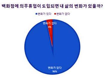 특히 90% 넘는 응답자가 백화점 의무휴업이 도입되면 본인과 가족의 삶에 상당한 변화가 있을 것이라고 기대했다.