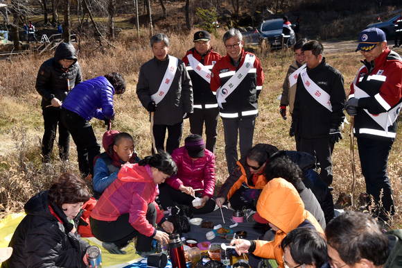 [프라임경제] 김재현 산림청장(가운데)과 태백생명의 숲, 산림청 직원들이 19일 강원도 태백시 소도동 태백산국립공원에서 등산객들에게 산불예방 캠페인을 하고 있다.