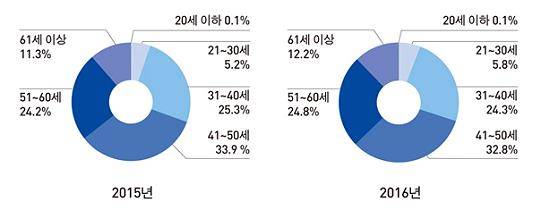 특히 20대가 전년도 5.2%에서 5.8%로 소폭 늘어났고 30대는 1%포인트, 40대는 1.1%포인트 하락했다. 반면 50대 고객 비중은 전년도에 비해 0.6%, 60대는 0.9%포인트 늘어났다.