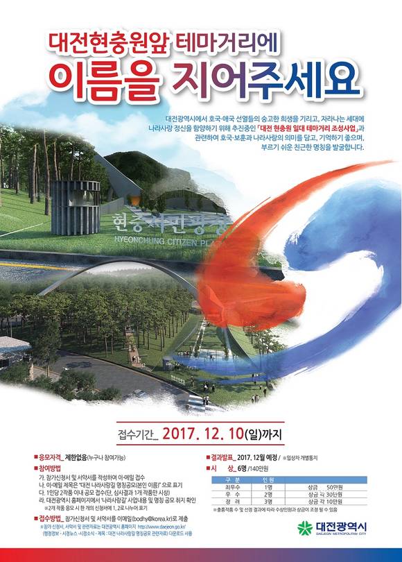 [프라임경제] 대전광역시는 '대전현충원 일대 테마거리 조성사업'을 시행하면서 호국, 애국, 보훈의 의미가 담긴 거리 명칭을 공모한다고 22일 밝혔다.