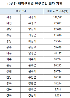 통계청 인구이동통계자료에 따르면 수도권을 제외한 지난 10년(2007년~2016년)동안 국내 17개 시·군·구 각 지역별로 가장 많은 인구유입이 있었던 곳은 △강원 원주 2만9724명 △세종 14만2505명 △대전 유성구 7만2827명 △충북 청원군 1만8244명 △충남 아산 6만5544명 △광주 광산구 5만9478명 △전북 완주군 9718명 △전남 무안군 2만298명 △경북 경산 8625명 △경남 양산 7만2028명 △부산 기장군 7만1846명 △대구 달성군 4만8197명 등 이다.