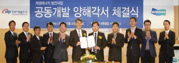 [프라임경제] 한국서부발전(사장직무대행 정영철, 이하 서부발전)은 22일 두산중공업 서울사무소(서울 서초구 소재)에서 두산중공업과 '재생에너지 발전사업 공동개발'을 위한 양해각서를 체결했다고 밝혔다.