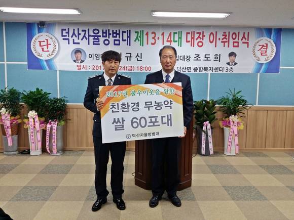 [프라임경제] 충남 예산군 덕산면자율방범대장 이·취임식(이임 김규신, 취임 조도희)이 24일 덕산면 종합복지센터에서 열렸다. 제14대 자율방범대장으로 취임한 조도희 대장은 지역사회 어려운 이웃들에게 전달해달라며 이·취임식과 동시에 150만원 상당의 쌀 600㎏을 전정환 덕산면장에게 전달했다.