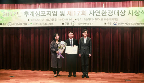 올해로 17회를 맞은 자연환경대상 공모전은 생태적, 친환경적으로 우수하게 보전·복원한 사례를 발굴하여 녹색산업의 발전을 도모하고, 전국적 확산 계기 마련을 위해 개최하는 행사로서 생태복원분야 최고의 상으로 꼽힌다.
