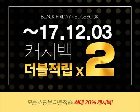 [프라임경제] 엣지북이 블랙프라이데이를 기념해 다음 달 3일까지 '더블캐시백 이벤트'를 진행한다고 27일 밝혔다.