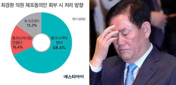 이와 관련 27일 미디어오늘이 여론조사업체 에스티아이에 의뢰한 여론조사 결과 응답자의 68.4%가 최 의원에 대한 체포동의안이 회부될 경우 통과시켜야 한다는 입장을 밝힌 것으로 나타났다.