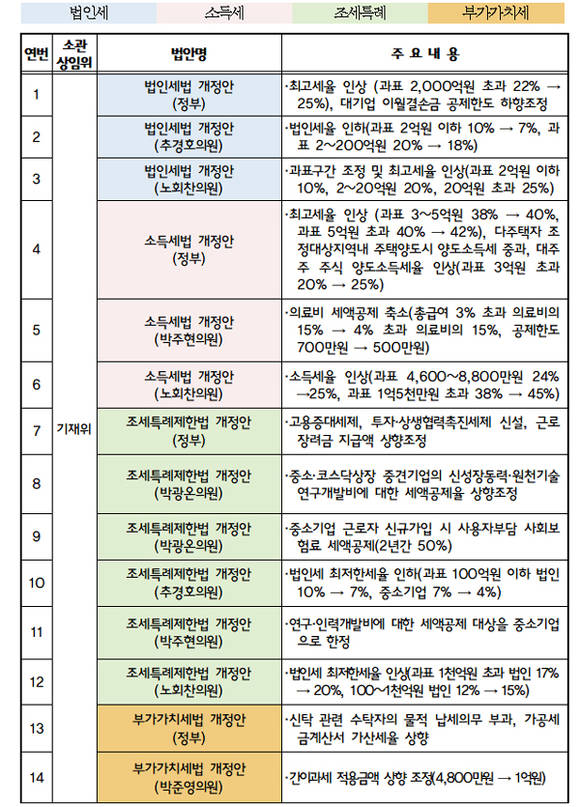 박주현 국민의당 의원 역시 연구·인력개발비 세액공제 대상을 중소기업으로 한정하도록 했으며 노회찬 의원은 법인세 최저한세율을 과표 1000억원 초과 법인의 경우 현행 17%에서 20%로 올리고, 100억~1000억원 사이 법인 역시 12%에서 15%로 인상하는 안을 발의했다.