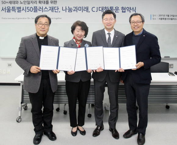 CJ대한통운은 지난 29일 '50+세대와 노인 일자리 확대를 위한 서울특별시50플러스재단-(사)나눔과미래-CJ대한통운 협약식'을 가졌다고 30일 밝혔다.