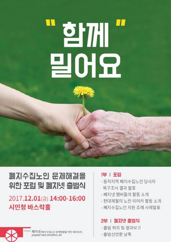 1일 폐지넷에 따르면 기초생활수급 노인보다 비수급 노인이 많아 실질적 경제적 어려움이 있는 노인들이 폐지 수집 활동을 많이 하는 것으로 조사되는 등 근본적 대안 마련을 이날 오후 2시 서울 시민청 바스락홀(지하 2층)에서 방안 모색을 위한 포럼을 마련하고 폐지넷 출범식도 함께 개최한다.