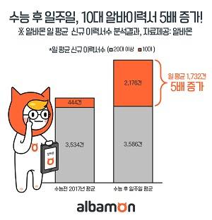 이에 따라 알바몬 신규 이력서 중 10대 이력서의 비중도 크게 높아졌다. 2017년 1월1일부터 11월22일까지 일 평균 신규 이력서 3978건 중 10대 이력서 비중은 11.2%에 불과했다. 그러나 수능 후 일주일간 신규 이력서수 중 10대 비중은 37.8%로 26%p 이상 급증했다. 20~50대 이상에 이르는 기타 연령층의 신규 이력서가 연 평균 수준을 기록하는 동안 10대 이력서만 약 5배 늘어난 것.