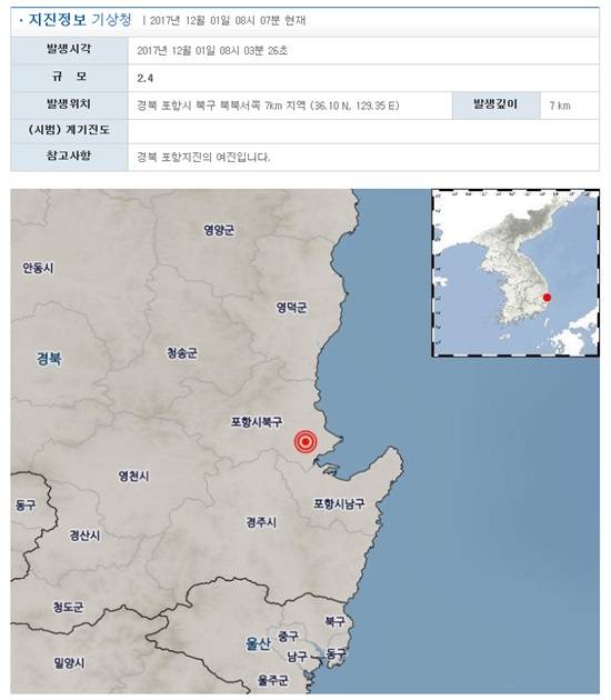경북 포항서 규모 2.4 지진이 발생했다. 기상청은 이 지진을 지난 15일 발생한 5.4 포항 지진의 여진으로 분석했다.
