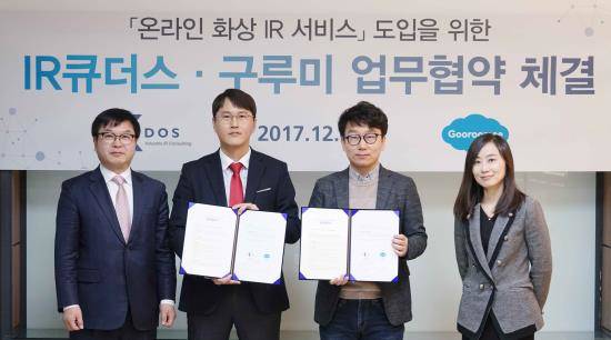 [프라임경제] IPR컨설팅 선도기업 IR큐더스(대표 이준호·이종승)는 화상통신 플랫폼 전문기업 구루미(대표 이랑혁)과 손잡고 상장기업을 대상으로 한 '온라인 화상IR(기업설명회) 서비스'를 전격 출시한다고 5일 알렸다.