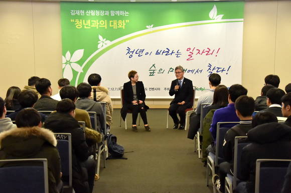 [프라임경제] 김재현 산림청장은 7일 인천 송도컨벤시아에서 열린 '2017 산림일자리 박람회'에서 박람회장을 찾은 학생들에게 '청년이 바라는 일자리, 숲의 미래에서 찾다'라는 주제로 특강을 마친 뒤 산림분야 일자리 정보와 취업에 대한 대화를 나눴다.