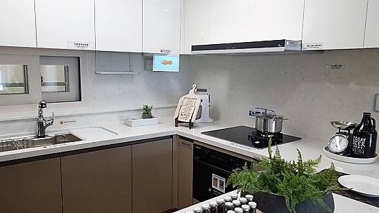 주방 설계는 'ㄷ'자 형태로 조리공간은 충분해 보였으며 천연석을 이용한 상판은 실용적이고 고급스러운 느낌을 줬다. 또 층간소음 저감을 위해 거실, 주방, 침실까지 일반(30㎜)보다 2배 두꺼운 60㎜의 바닥차음재를 적용한 점은 눈길을 끌었다.