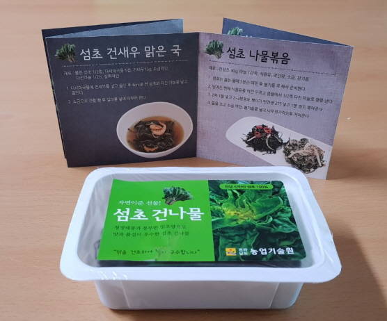 도농기원은 이러한 농가애로사항 해결을 위해 품질이 우수한 섬초 건나물 제조기술을 개발·보급했으며, 개발된 섬초 건나물 소비확대를 위해 누구나 가정에서 손쉽게 요리할 수 있는 섬초 부각, 섬초 장아찌, 섬초 프리타타 등 섬초 건나물을 활용한 요리법 7종을 개발하고 리플렛을 발간했다.
