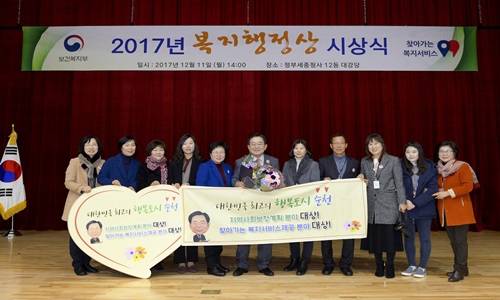 11일 보건복지부 주관 2017년 복지행정상 합동 시상식에서 순천시는 민·관·학 소통과 협력으로 시민이 체감하는 따뜻한 복지도시임을 입증했으며 2년 연속 보건복지부 기관 표창과 함께 포상금 9000만원을 받았다.