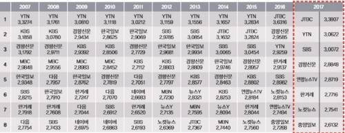 '미디어 맏형'으로 자리매김해온 KBS와 MBC는 신뢰·공정·유용 전 부문에서 2017년 8대 미디어에 속하지 못하고 불명예를 얻었다.