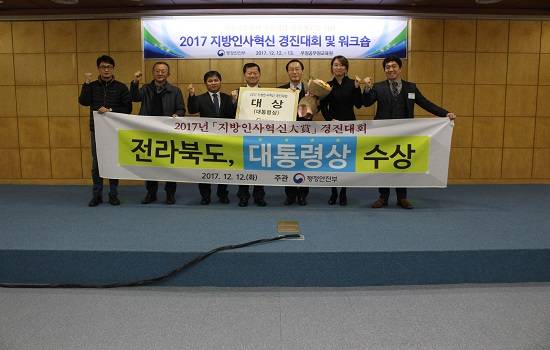 행정안전부는 12일 천안 우정공무원교육원에서 '2017년 지방자치단체 인사혁신대상 경진대회'를 열고 우수지자체 사례에 대한 발표와 평가를 실시했는데, 이날 전북도가 전국 최우수 사례로 선정돼 대통령 표창을 받았다.
