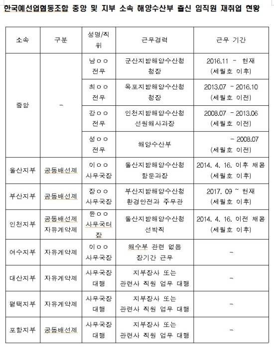 실제로 예선업협동조합은 해수부 출신 임직원들이 재취업하는 사례가 유난히 많다. 중앙 조합의 상임 전무이사는 지난 2008년부터 해수부 국장 및 지방청장급 인사들이 연달아 취업하고 있는가 하면, 지부 사무국장은 각 지방청의 과장 또는 주무관급 인사들이다. 부산지부 역시 지난 1982년부터 지금까지 근무했던 7명의 사무국장 중 6명이 해수부 공무원 출신이다.