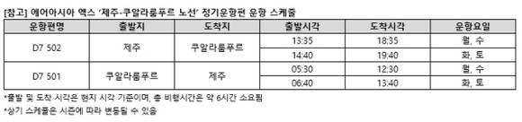 이번 제주~쿠알라룸푸르 노선은 에어아시아 엑스가 인천과 부산에 이어 세 번째로 취항하게 되는 노선이자 국내 최초 및 단독으로 운영하는 노선이다. 해당 노선에는 총 377석(프리미엄 플랫베드 12석 포함)의 A330 기종이 투입돼 주 4회(월·화·수·토요일) 운항한다.
