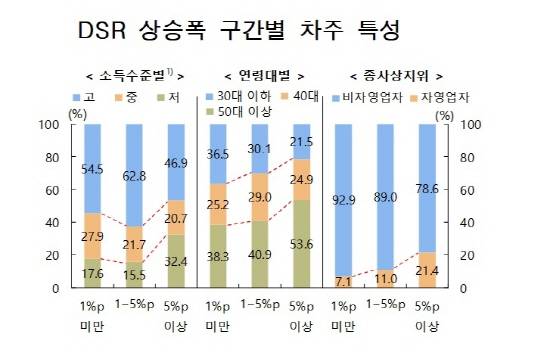 DSR 상승폭 구간별로 차주의 특성을 살펴보면, DSR 상승폭이 큰 구간에서 저소득층(하위 30%), 50세 이상, 자영업자의 비중이 높았다.