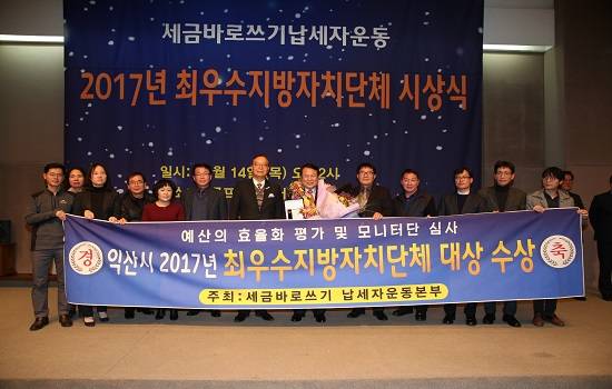 [프라임경제] 익산시(시장 정헌율)는 세금바로쓰기납세자운동본부(대표 김성호, 전 법무장관)가 전국 243개 지방자치단체 대상으로 실시한 예산의 효율화 평가 부문에서 2017년 최우수지방자치단체 '대상'으로 선정됐다고 14일 밝혔다. 정헌율 시장은 이날 서울 한국프레스센터에서 개최된 시상식에서 대상 기관표창을 받았다.