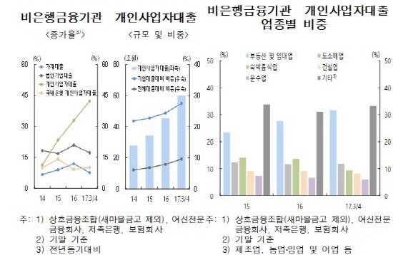 한은 관계자는 "비은행 개인사업자대출의 연체율은 최근 하락세를 지속하고 있으나, 2014년 이후 부동산시장 호조, 최근의 주택담보대출 규제 강화 등으로 부동산 및 임대업 비중이 빠르게 상승하고 있는 점에 유의해야 한다"고 지적했다.