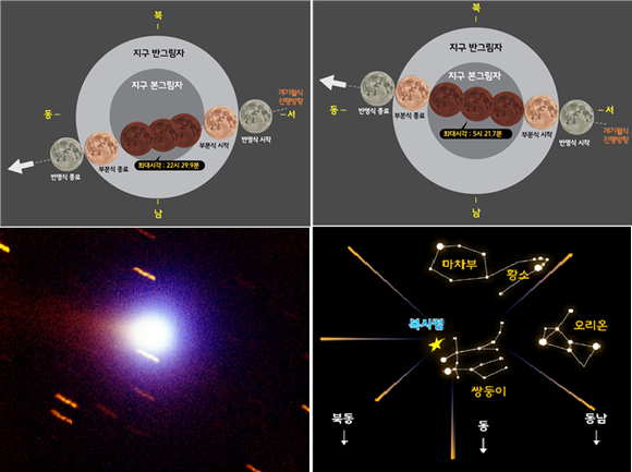 개기월식이 일어날 때는 검붉은 달을 볼 수 있다. 이는 지구 대기를 통과한 태양빛이 굴절되며 달에 도달하는데, 지구 대기를 지나면서 산란이 일어나 붉은 빛이 달에 도달하기 때문이다. 12월13일에는 비르타넨 혜성(46P/Wirtanen)이 태양과 가장 가까워지는 지점인 근일점을 통과하는 모습도 볼 수 있다.