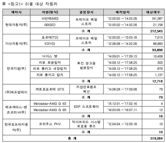 국토교통부(장관 김현미)는 6개 업체에서 제작하거나 수입해 판매한 자동차 총 12개 차종 31만9처264대에 제작결함이 발견돼 자발적으로 시정조치(리콜)한다고 15일 밝혔다.