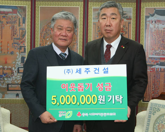 [프라임경제] 세주건설이 15일 오후 4시30분 청주시청 접견실에서 청주지역 저소득 가정을 위해 써달라며 500만원을 기탁했다.
