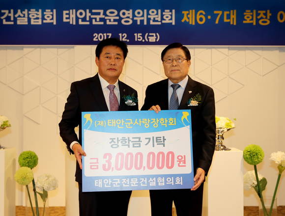 18일 군에 따르면, 태안군 전문건설협의회는 지난 15일 태안읍 동문웨딩홀에서 한상기 군수와 전문건설협회 임원 등이 참석한 가운데 열린 '태안군 전문건설협의회장 이·취임식'을 통해 태안군에 장학금 300만원을 기탁했다고 밝혔다.