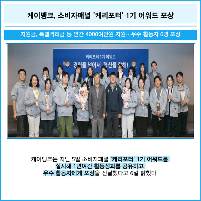 [프라임경제] 케이뱅크는 지난 5일 소비자패널 '케리포터' 1기 어워드를 실시해 1년여간 활동성과를 공유하고 우수 활동자에게 포상을 전달했다고 6일 밝혔다.