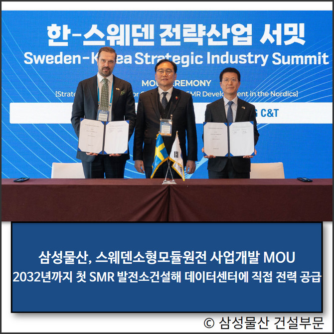 삼성물산은 지난 5일 한국-스웨덴 전략산업 서밋 행사에서 스웨덴 민간 SMR 개발사인칸풀 넥스트(Karnfull Next AB)와 스웨덴 SMR 사업 개발을 위한 협력 MOU를 체결했다. 이날 그랜드 하얏트 서울 호텔에서 진행된 체결식에는 크리스티안 셸란 칸풀 넥스트 대표이사와 정인교 산업통상자원부 통상교섭본부장, 그리고 오세철 삼성물산 건설부문 대표이사가 참석했다.