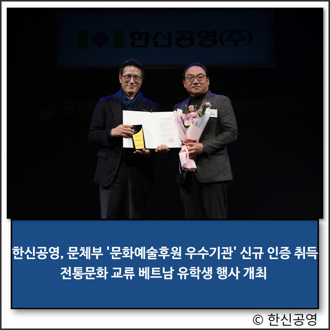 한신공영(004960)이 문화예술 활동을 통한 사회공헌의 성과를 인정받아 2024년 문화예술후원 우수기관 신규 인증을 받았다.