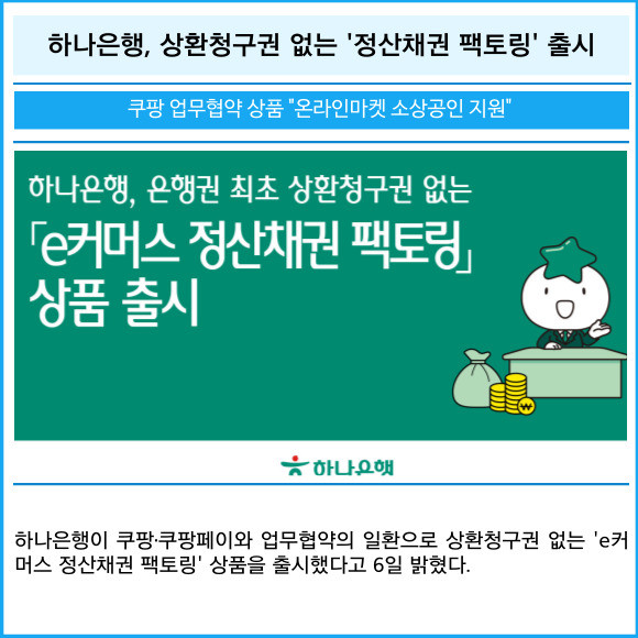 [프라임경제] 하나은행이 쿠팡·쿠팡페이와 업무협약의 일환으로 상환청구권 없는 'e커머스 정산채권 팩토링' 상품을 출시했다고 6일 밝혔다.