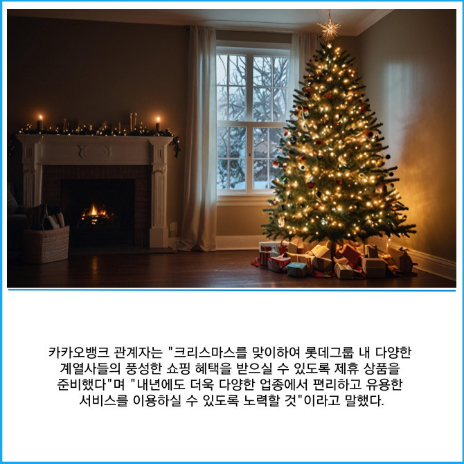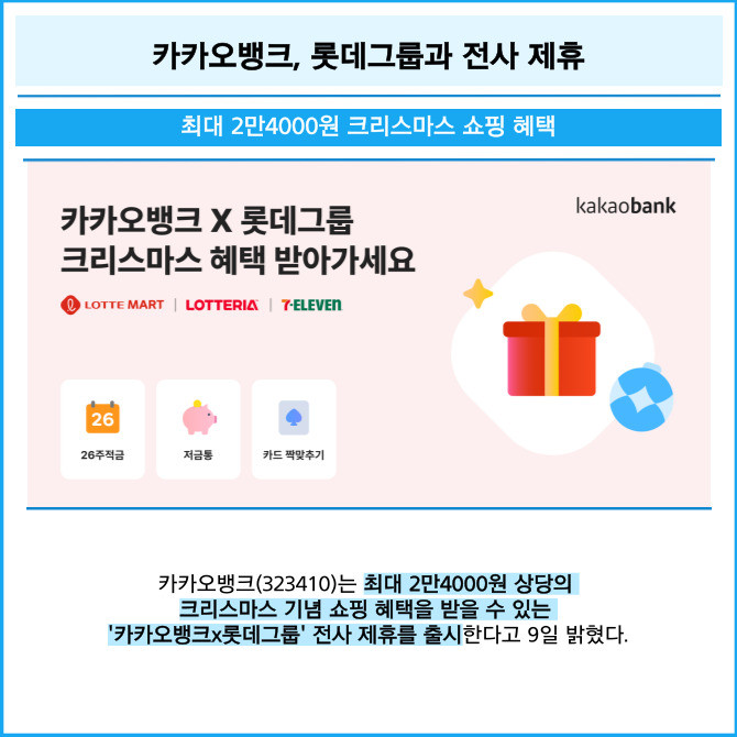 [프라임경제] 카카오뱅크(323410)는 최대 2만4000원 상당의 크리스마스 기념 쇼핑 혜택을 받을 수 있는 '카카오뱅크x롯데그룹' 전사 제휴를 출시한다고 9일 밝혔다.