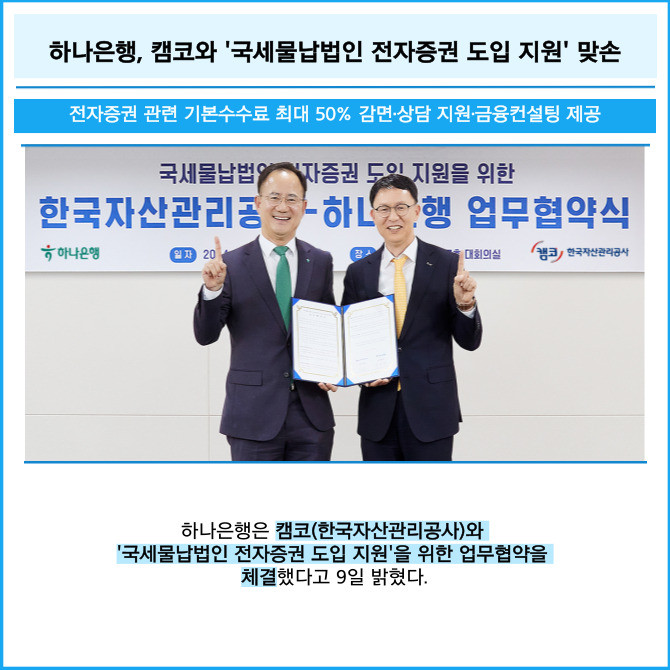 [프라임경제] 하나은행은 캠코(한국자산관리공사)와 '국세물납법인 전자증권 도입 지원'을 위한 업무협약을 체결했다고 9일 밝혔다.