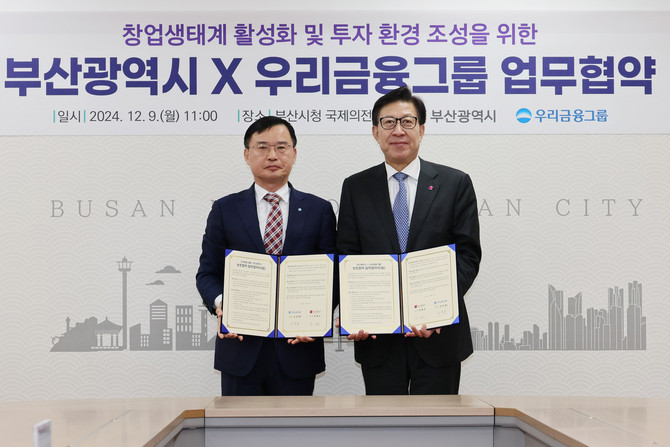 부산시는 9일 오전 시청 국제의전실에서 박형준 부산시장과 송윤홍 우리금융지주 성장지원부문 부사장이 참석한 가운데 '창업생태계 활성화와 투자 환경 조성을 위한 상호협력 업무협약'을 체결했다. 이번 협약은 스타트업 육성과 지역 경제 활성화를 목표로 한다.