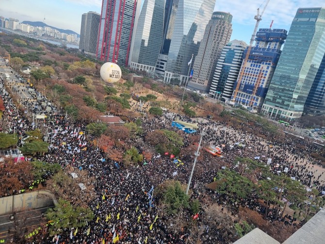 지난 7일 여의도 국회의사당 일대에서 열린 윤석열 대통령 퇴진을 촉구하는 대규모 시위에 참여한 시민 A씨는 "많은 사람이 몰려 지하철 9호선이 국회의사당과 여의도역에 정차하지 않을 정도"라고 말해 그날의 인파를 가늠케 했다.