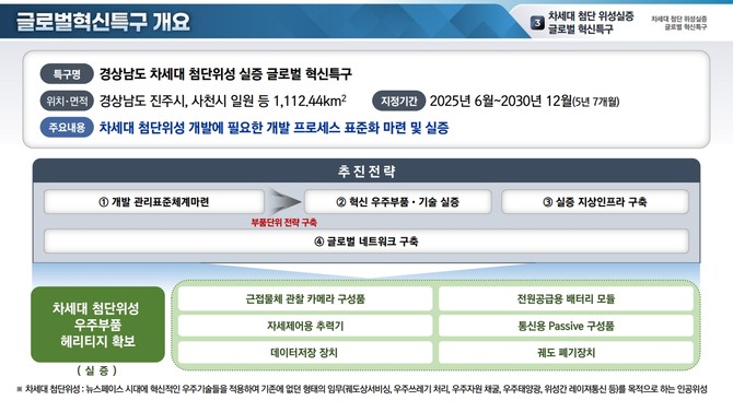 경남 차세대 첨단위성 실증 글로벌 혁신특구는 위성체‧발사체 제조시장과 민간위성 개발사업 수요 확대에 대응하기 위해, 진주시와 사천시를 거점지역으로 지정하고 경상국립대학교를 총괄 주관기관으로 선정했다.